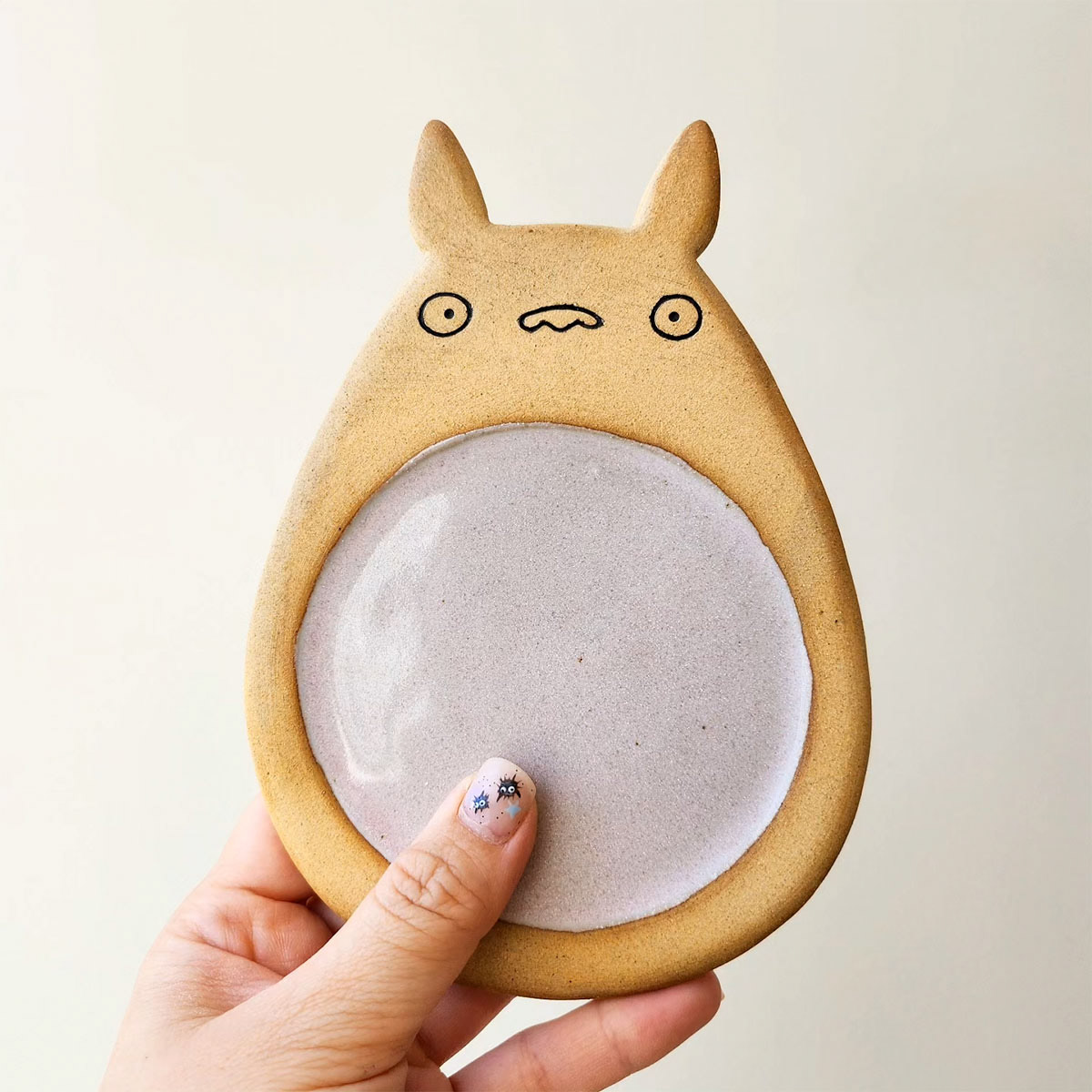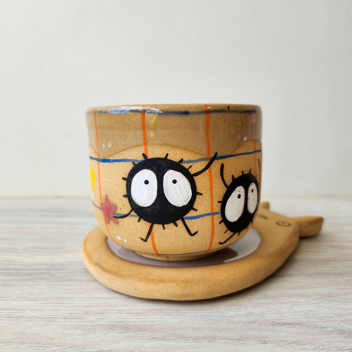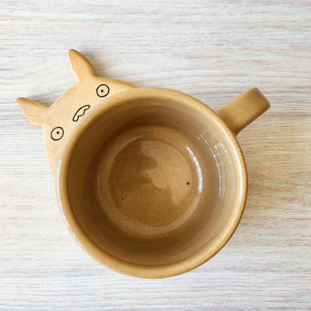 Medidas aproximadas: Caneca: 7,5 cm (altura) x 9 cm (diâmetro) x 12 cm (diâmetro + alça) • Capacidade: 250 ml Prato Totoro: 1 cm (altura) x 15 cm x 12 cm