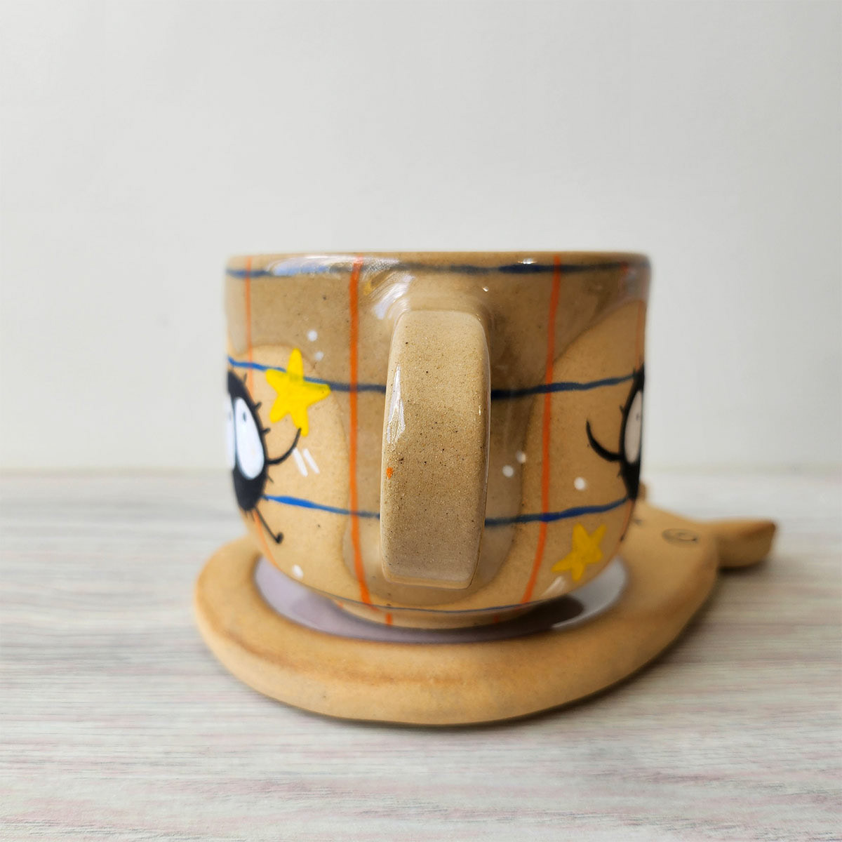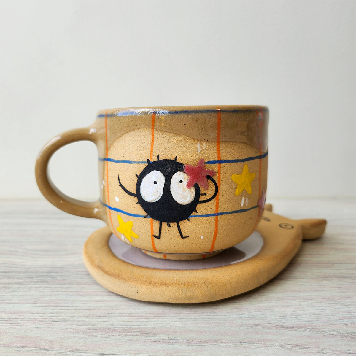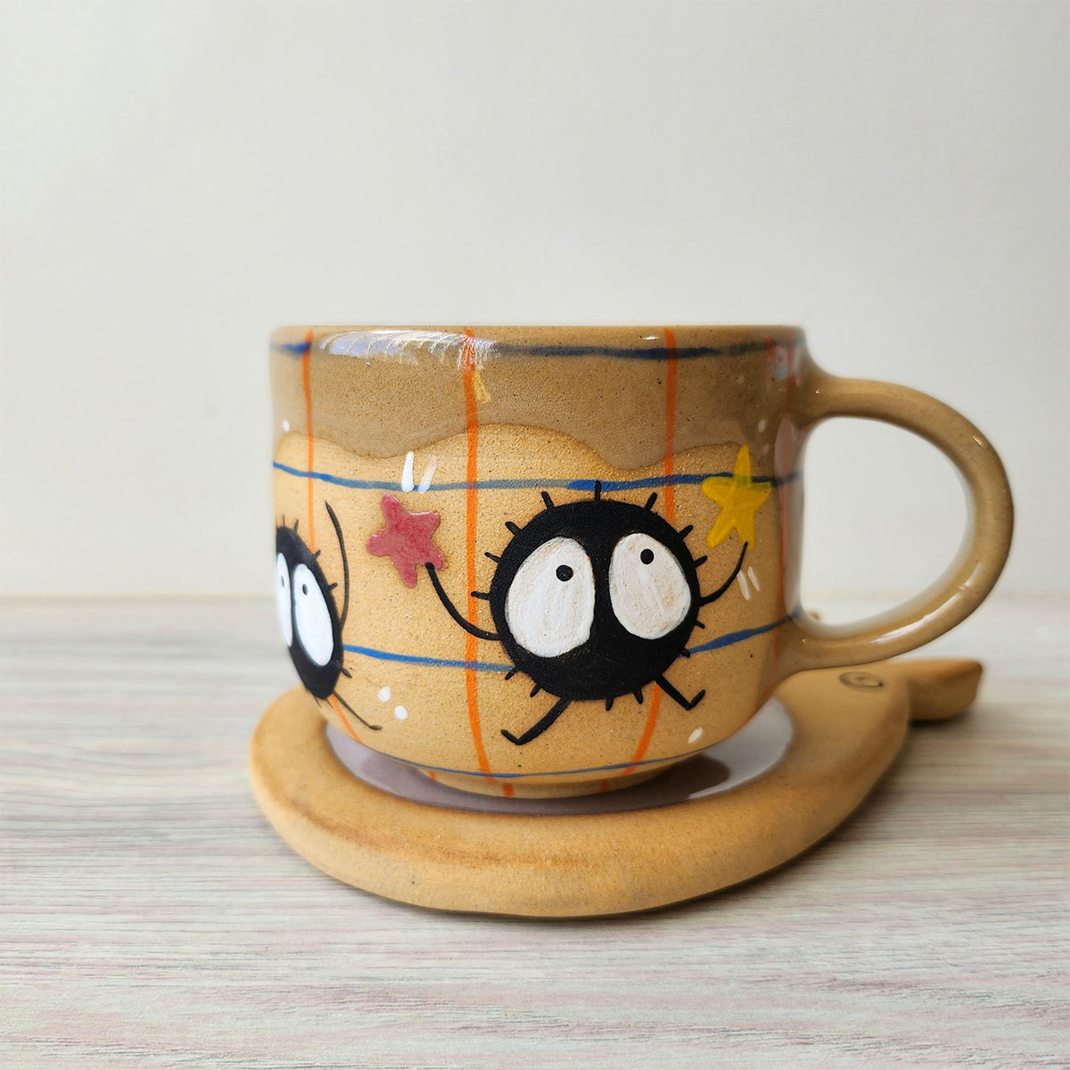 Medidas aproximadas: Caneca: 7,5 cm (altura) x 9 cm (diâmetro) x 12 cm (diâmetro + alça) • Capacidade: 250 ml Prato Totoro: 1 cm (altura) x 15 cm x 12 cm